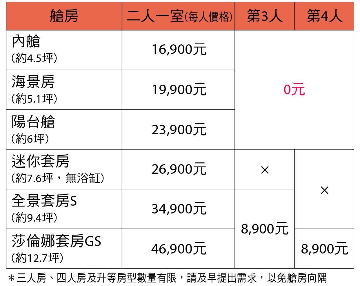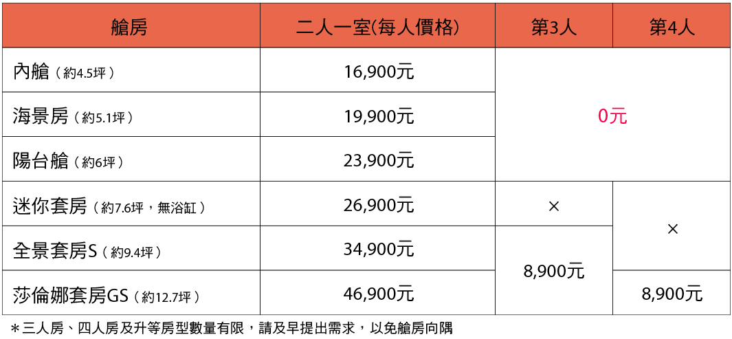 - 以上售價為遊輪船票費用,含遊輪靠港稅。